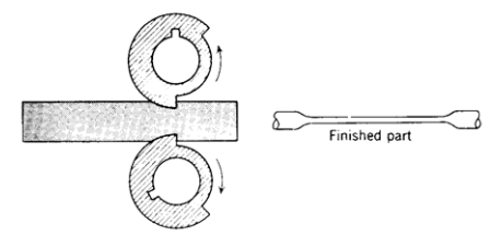 以两个非百分之百为圆形的辊子(有 25~75%的直径缩减率,其余部份可依需要切成槽形),将杆料送入其间并夹持之,而后继续转动,使杆料受轧压,使直径缩减并向前推送;当辊子再转到开口位置时,可将杆料抽回到原来的位置,以备次一循环轧滚,或送到另一沟槽作另一种施工。