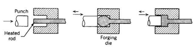 锻粗或端压锻造通常是针对一均匀长杆的一端欲进行锻粗或造形而來,如下图所示。将长杆在模子内夹紧,其一端加热至高温,并顺其轴向,再该端加压,使其锻粗或造形。