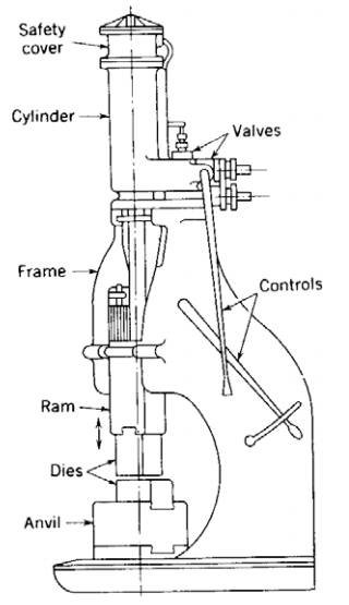 锤锻或打铁所用的方式相同,系将工作物加热到锻造温度,在平锤及钻板之间加以锻造; 小件可用手工称为打铁;大件则须使用蒸气锤(Steam Hammer),如下图。其中,工作物放在钻板与平面锤之间,至于蒸汽锤的构造,则依锻造容量而定,轻型者为单机架式, 重型者为双机架式。
