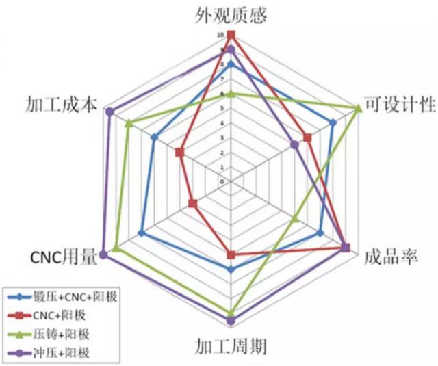 下图描述了几种手机外壳金属加工工艺在加工成本、CNC用量、加工周期、成品率、可设计性、外观质感的比较。
