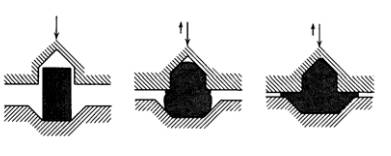 落锤锻造与平面锻造的不同,在于落锤锻造的锤有模穴,工作件在模穴中承受兩方面的压力或冲击力作用,进而依模穴的形状作塑性变形。 如下图所示,为了使金属的流动能确实而充份,往往将锻造分为若干级次,每级的变化为渐进式,以利控制流动方向,至于级数的多寡, 端视锻件的形状与大小,金属的可锻性及工件尺寸精度要求。