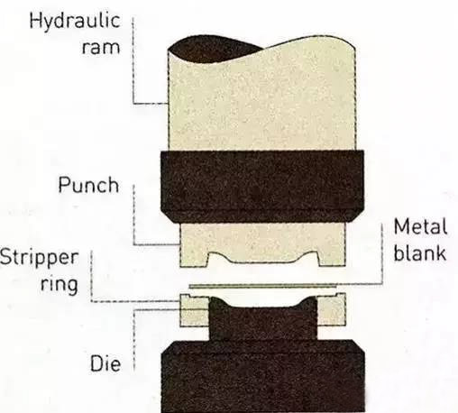 2、上方冲头垂直下落,使金属板材在模具内部受力成型